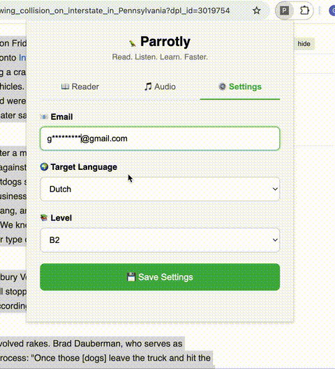 Tired of practicing your language skills on texts that you have -5 interest in? Listening to boring audio on things that are irrelevant? Not anymore! With Parrotly, adapt things you want to read and/or listen to!